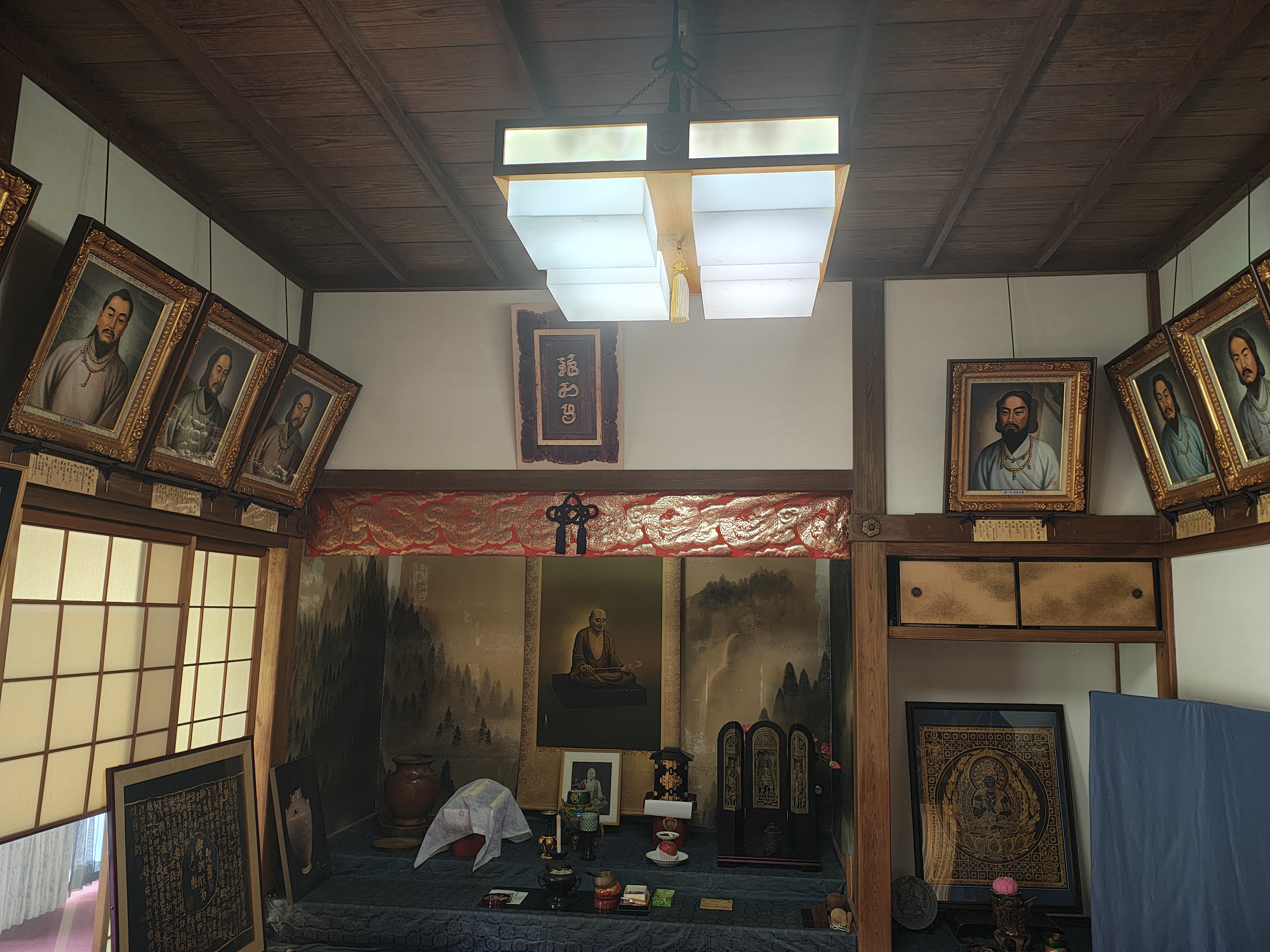 昭和の復興の際、三條妙節師は、龍門寺開祖義渕僧正が幼少の頃天智天皇に養育された故事をしのび、歴代天皇のご供養を決意し、肖像画の第一人者であり、大日本肖像美術協会総長をつとめる馬堀法眼喜好画伯に揮毫を要請しました。そして、馬堀画伯より、神武天皇より百二十四代の御真影が寄贈されました。