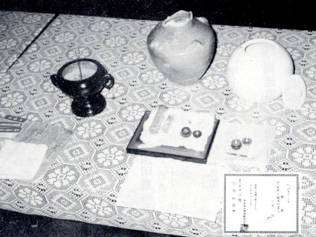 さらに昭和58年3月3日には、解体補強工事中の五輪塔から骨壺が出土、青磁の四耳壷には火葬した40歳から50歳位と推定されるお骨が発見されました。そして4月、お骨は中川善教師寄進の壷に入替えて元の位置に、舎利は水谷醒洋師製作寄進の容器に入替えて五輪塔水輪に埋葬されました。